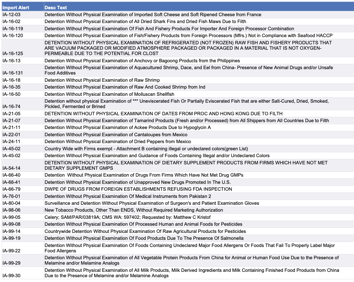 Recent modifications to FDA’s import alerts, as posted by the agency, are listed below.