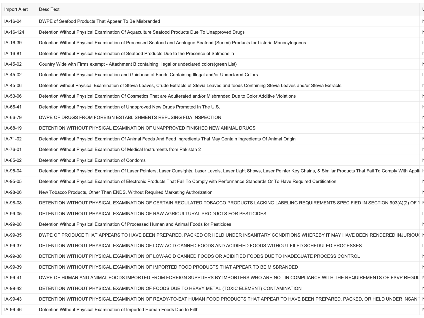 Recent modifications to FDA’s import alerts, as posted by the agency, are listed below.