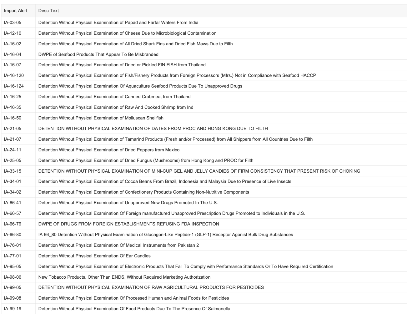 Recent modifications to FDA’s import alerts, as posted by the agency, are listed below.