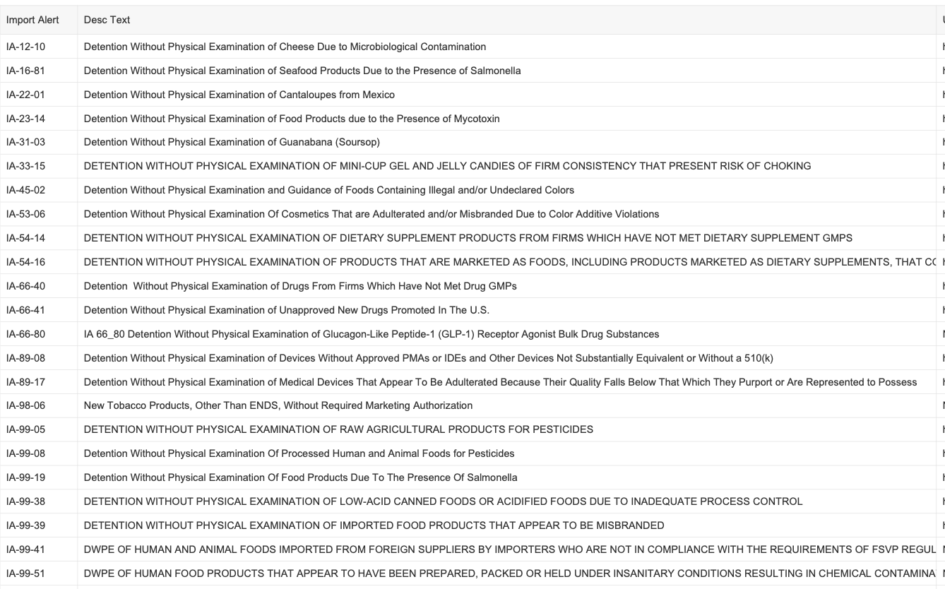 Recent modifications to FDA’s import alerts, as posted by the agency, are listed below.