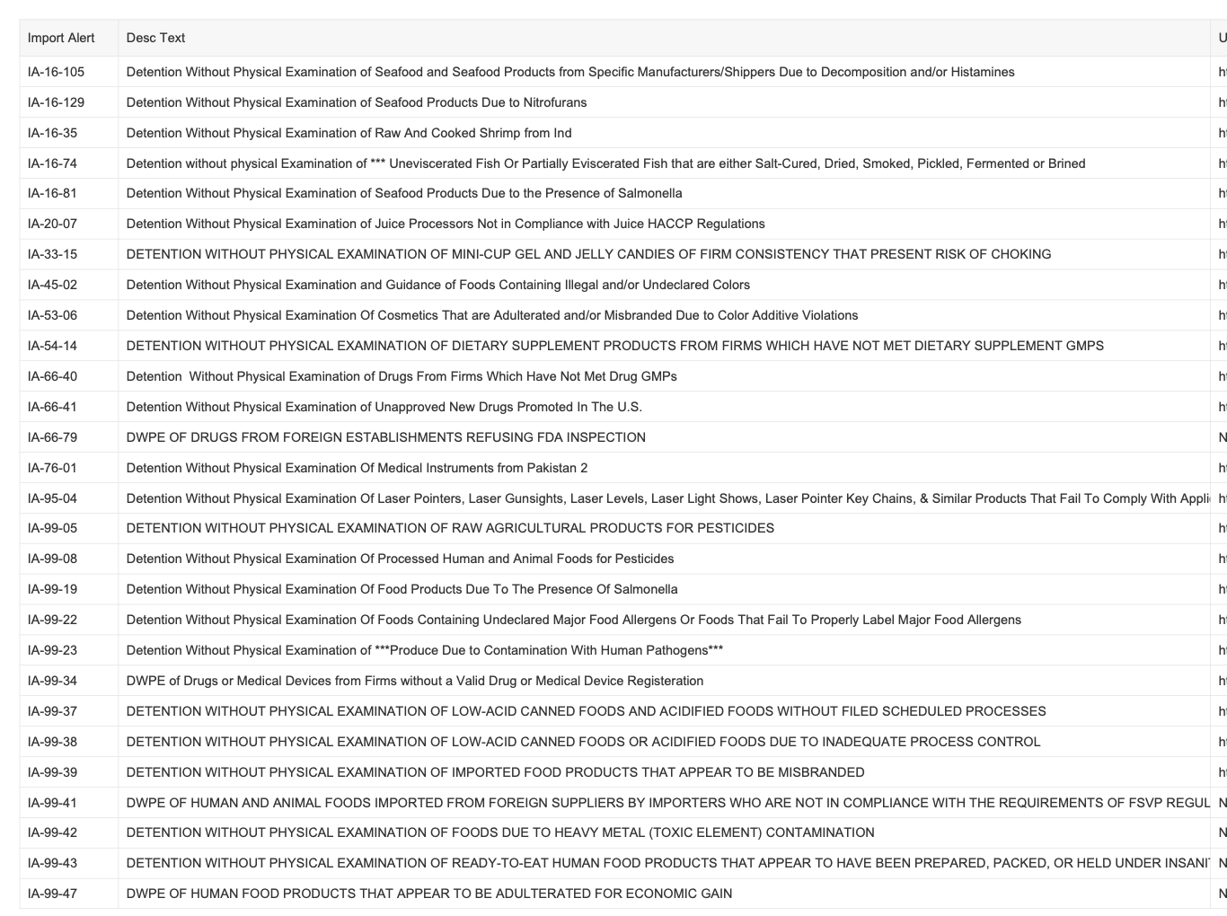 Recent modifications to FDA’s import alerts, as posted by the agency, are listed below.
