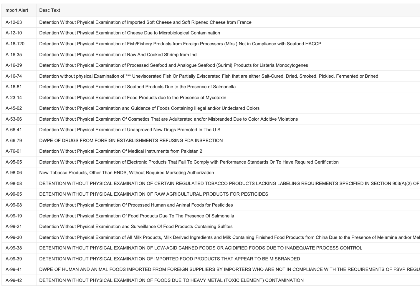 Recent modifications to FDA’s import alerts, as posted by the agency, are listed below.