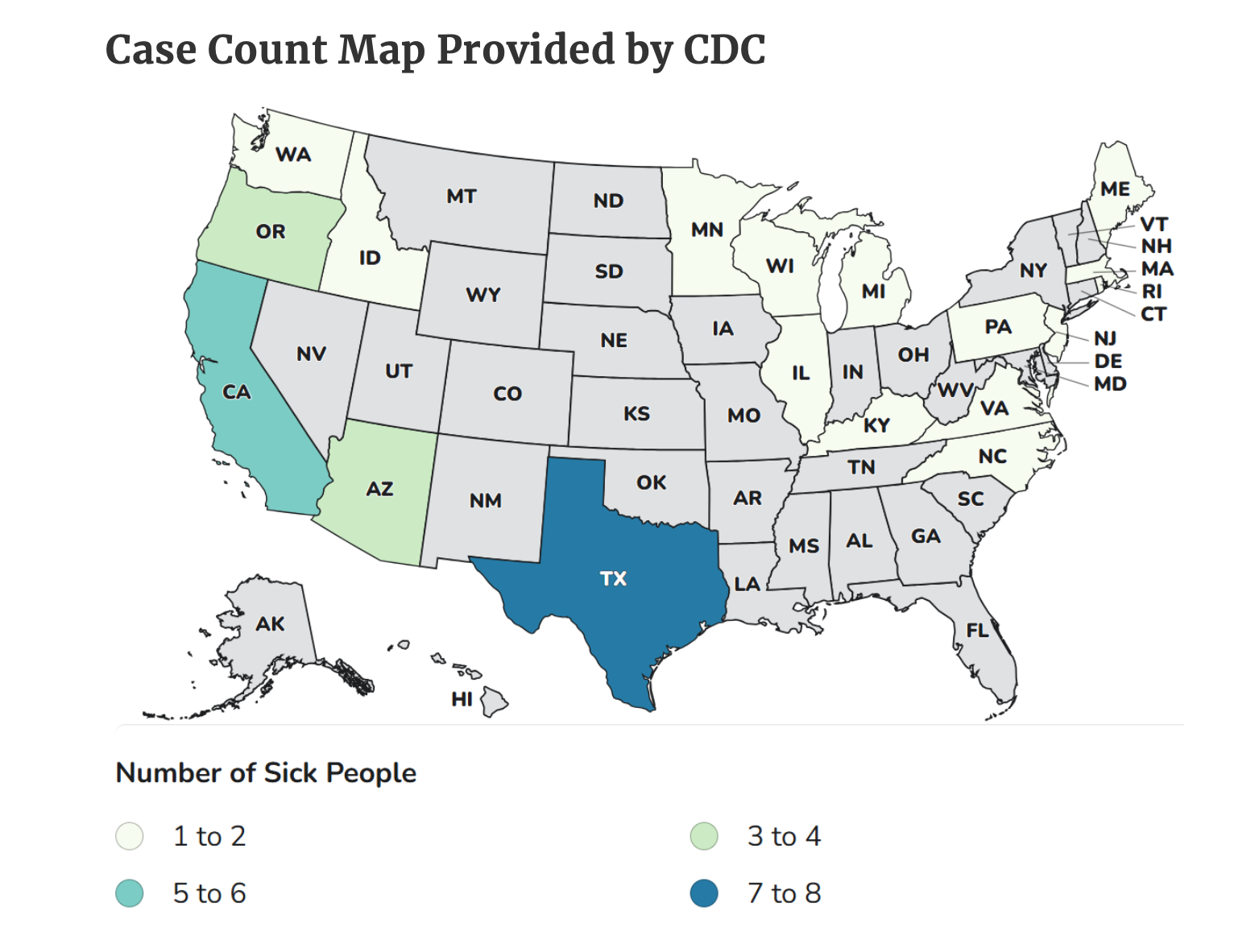 The Food and Drug Administration reports that there are now 39 infants across 18 states from coast to coast who are infected. All of the infants have required hospitalization. The sick infants live in Arizona, California, Idaho, Illinois, Kentucky, Massachusetts, Maine, Michigan, Minnesota, North Carolina, New Jersey, Oregon, Pennsylvania, Rhode Island, Texas, Virginia, Washington and Wisconsin.