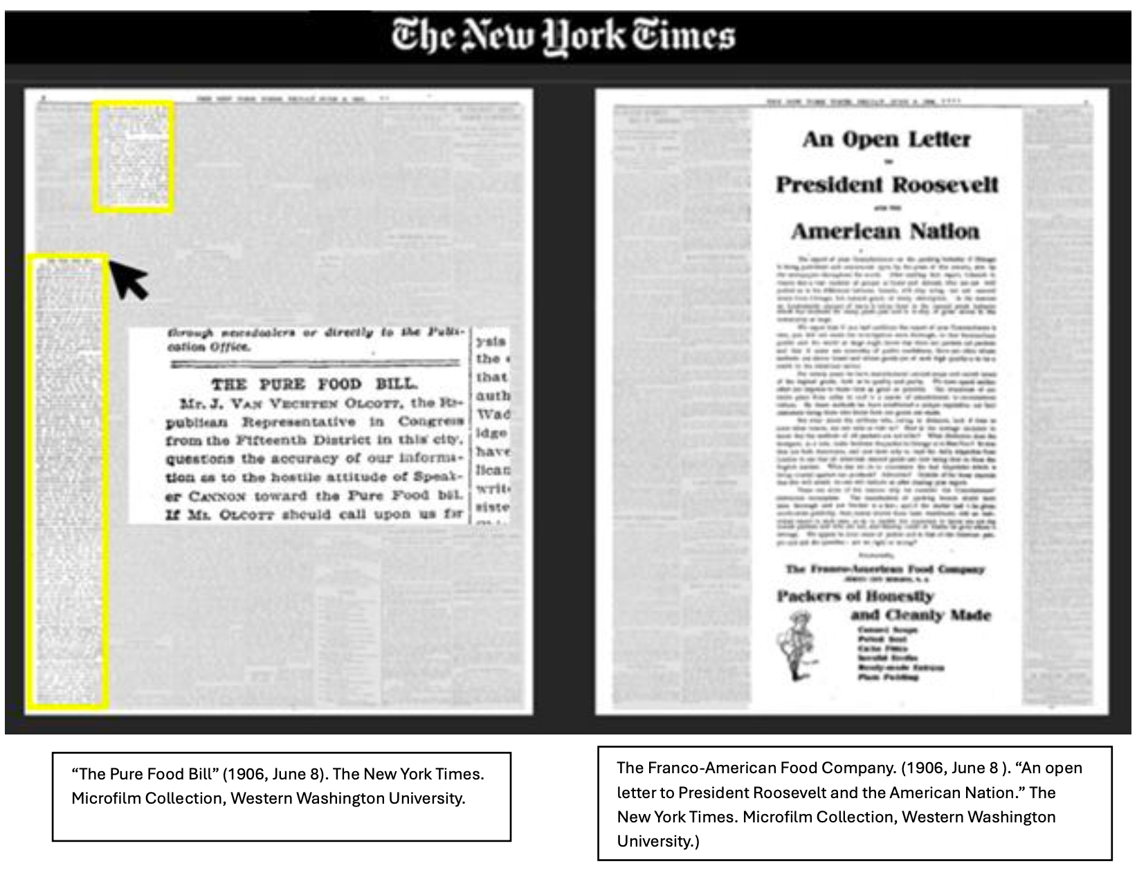 On June 8, 1906, the New York Times reported on Congressional action toward what would become the Pure Food and Drug Act. On that same day, the Franco-American Food Company purchased a prominent, nearly full-page advertisement positioned opposite coverage of the proposed law, visually reinforcing its response.