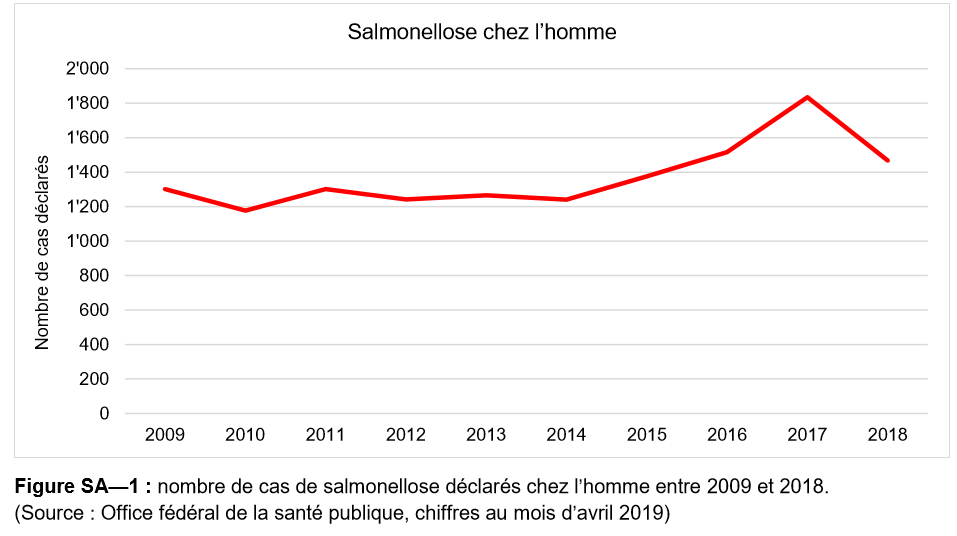 Cases of salmonellosis declined from more than 6,000 per year in the early 1990s to about 1,300 annual infections in 2009. From 2009 to 2014, the number was stable but for an unknown reason, it has been on the rise since 2015.
