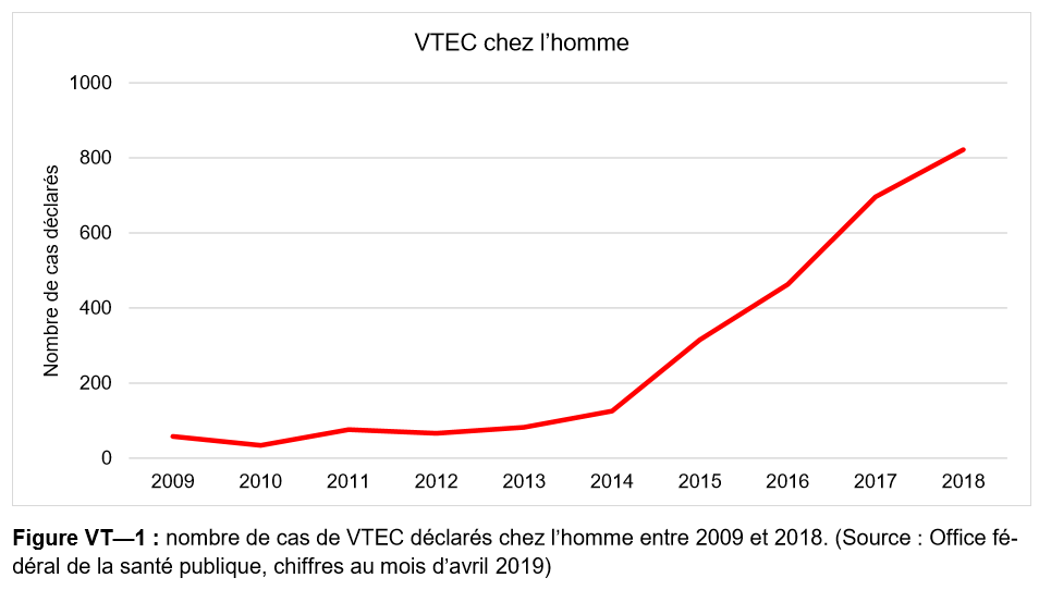 With 822 confirmed cases, the year was marked by a further increase in verotoxigenic E. coli (VTEC) or Shiga toxin-producing E. coli (STEC) infections in humans versus the 696 reports in 2017. Infection rate is the highest since the introduction of reporting obligation in 1999. The main cause of this increase is likely to be laboratories are testing more and can detect more cases because of new methods of analysis.