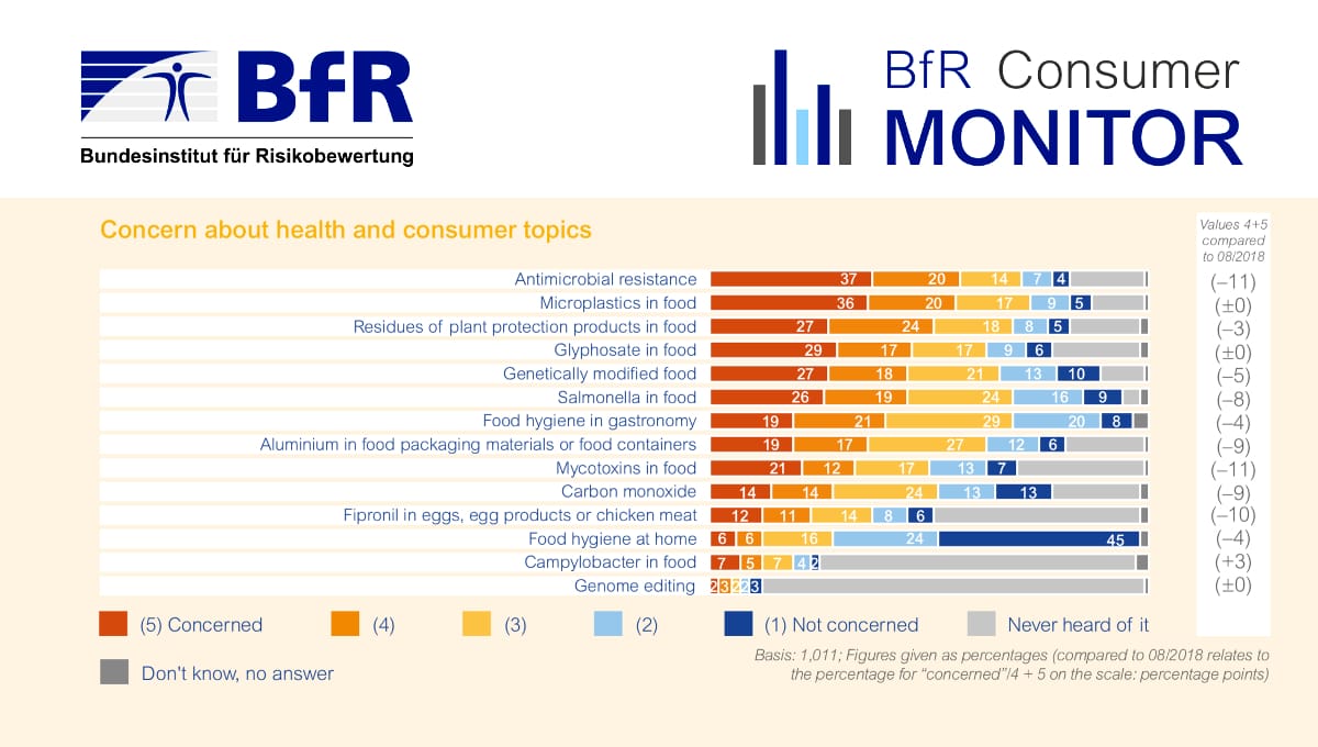 Just more than half said they trusted state authorities to protect consumer health. Overall people were not as concerned as they were in the last survey in summer 2018.As in the previous year, antimicrobial resistance and microplastics are still the topics most respondents are worried about. However, compared to the previous survey, the population is less concerned about antimicrobial resistance, with 57 percent reporting they were worried about it. Almost half said they were not worried about food hygiene at home.